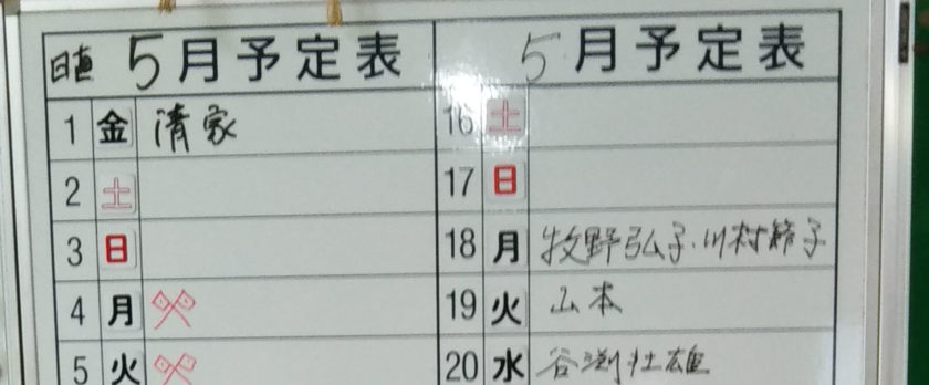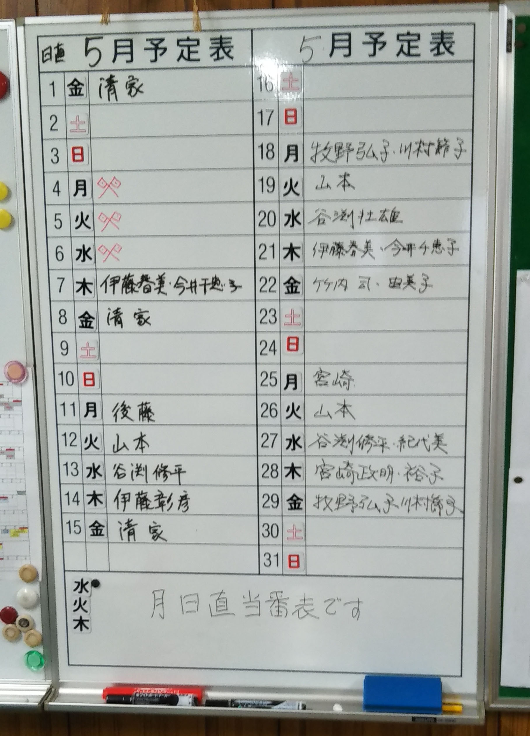 皆さん、こんにちは。管理者:竹内司です。5月度の事務所日直当番の方がすべて決まりました。山本代表世話人さんより写真で日直当番者の方の一覧表を頂きました。山本代表さんからは「5月分の日直が埋まりました。たくさんの方の協力に感謝です。ありがとうございます。」とのコメントがありました。