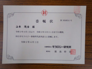 新代表世話人山本茂治さんに廣池理事長よりの委嘱状が授与されました。