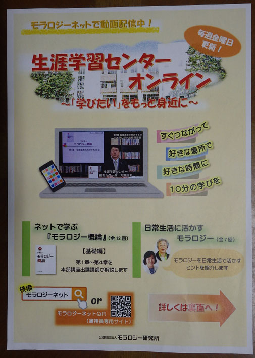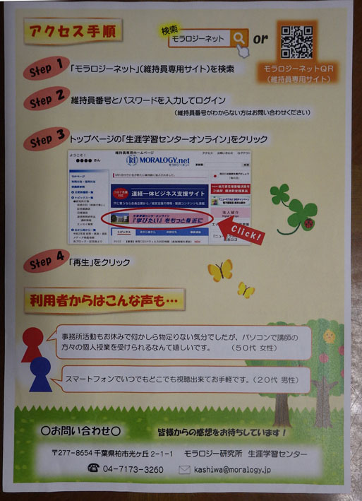 皆さんこんにちは。管理者竹内です。本日はモラロジーネット(維持員専用ホームページ)でオンライン学習ができるという情報をお届けします。まずは、下のパンフレットの説明をもとにモラロジーネットに入室してください。モラロジーネットへ入るためには維持員番号と西暦の生年月日の2つが必要です。維持員番号がわからない方は、四日市事務所にお問い合わせください。では以下の要領でモラロジーネットに接続して、オンライン学習を体験してください。