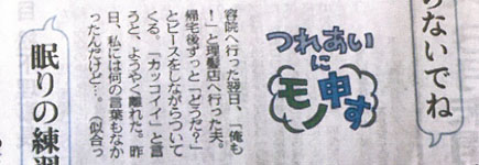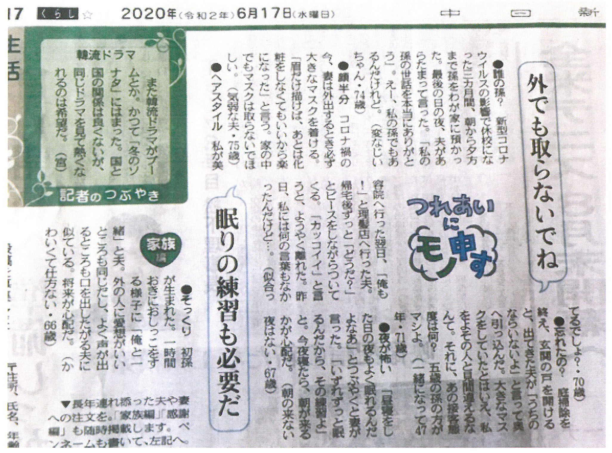 さて本日は、山本淑子さんからのほのぼのとした投稿です。中日新聞の「つれあいにモノ申す」というコーナーの内容と淑子さんご自身のコメントです。まず、中日新聞の「つれあいにモノ申す」の記事を読んでから淑子さんのコメントを読んでください。