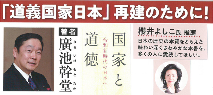 廣池理事長の著書「国家と道徳」をこの機会にぜひ、お読みください。櫻井よしこ先生からの推薦の書です。道義国家日本再建のための理事長の提言を是非ともご一読ください。