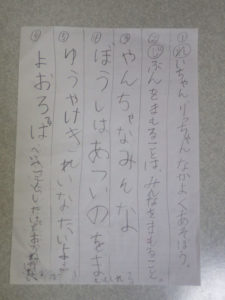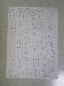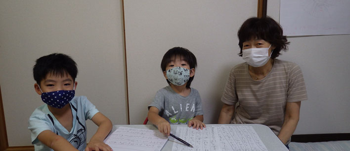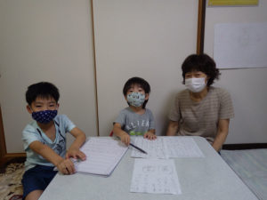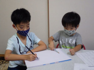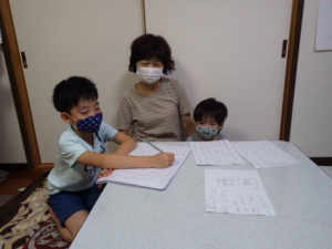 「ばあちゃんかけたぁ?」「まだだよ~。礼ちゃんは?」と楽しく会話をしながら2人で鉛筆を走らせています。弟くんはまだ字はかけませんが、鉛筆をにぎりしめて参加中です。