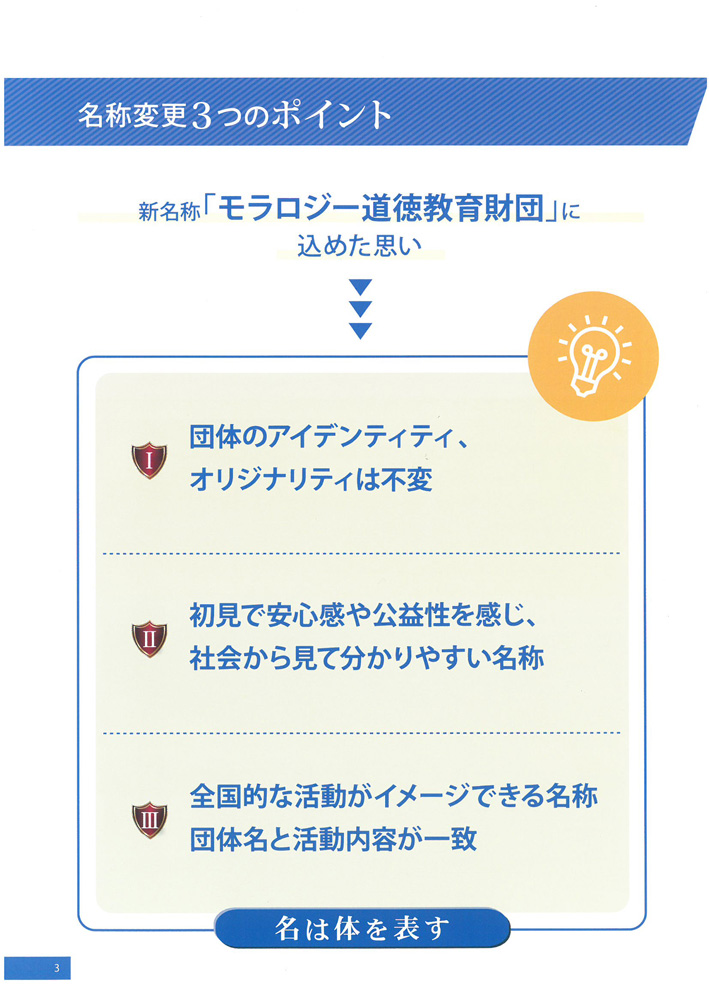 公益財団法人 モラロジー道徳教育財団への名称変更の詳しいパンフレットが事務所に届いておりますが、その表紙と名称変更のポイントのページのみをここではご紹介します。詳しくは事務所にありますパンフレットをご確認ください。