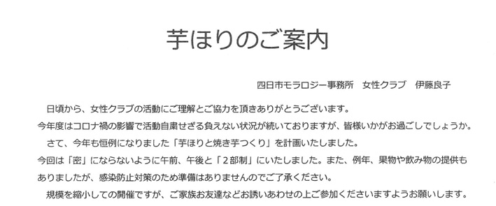 女性クラブの皆さんで企画、計画、準備をして頂いております「秋の芋ほり大会」の案内チラシを掲載します。今年はコロナの影響もあり、例年の運営方法を若干変更して開催をいたします。以下の案内チラシをご覧頂き、事前申し込みの上、ご参加をよろしくお願いします。