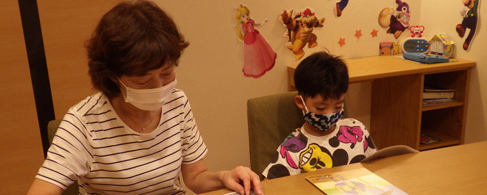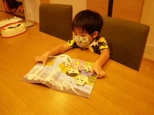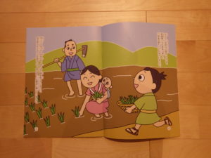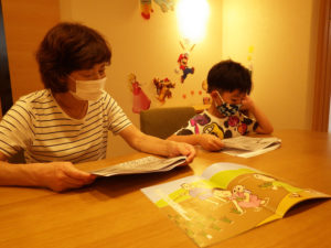 教材はモラロジー研究所発行の「親子で学ぶ偉人物語」です。小学校1年生には内容が若干難しいかなあとも思っていましたが、ふりがながあるので1年生の長男君が全部読んでくれていました。次男君も一緒のようにしたいらしく教科書を眺めています。本を読んだあとは、由美子ばあちゃんが内容の質問で振り返りをして約30分程度で終了しました。