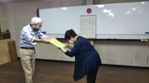 谷渕紀代美さんへ、本部からの記念品贈呈を伊藤副ブロック長の代行で行いました。