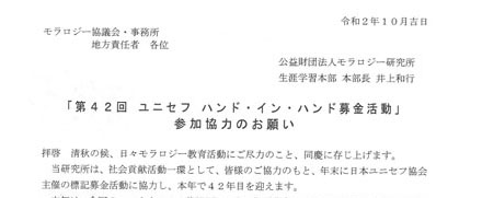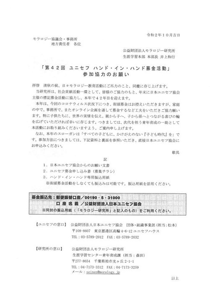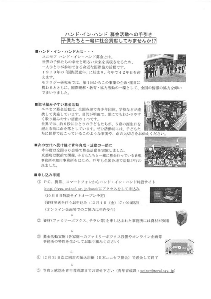 モラロジー研究所が毎年活動をしています「ユニセフ ハンド・イン・ハンド募金活動」への参加協力のお願いをご案内します。
