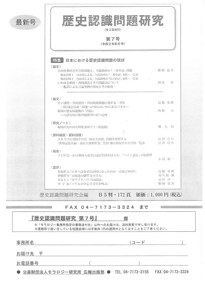 歴史認識問題研究 第7号発刊のお知らせです。 購読希望の方は、公益財団法人モラロジー研究所広報出版部へお申し込みください。