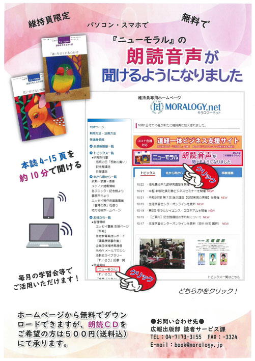 ご家族での勉強会、家庭座談会、家庭訪問などの各種学習会にたいへん便利です。 ニューモラル朗読音声を利用して、お子様との学習会はいかがでしょうか。