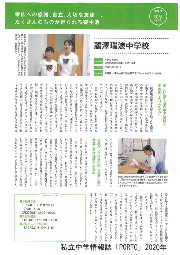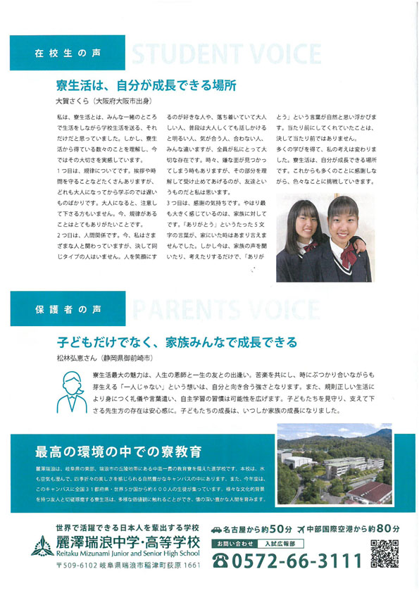 麗澤瑞浪中学・高等学校寮案内リーフのご案内が届きましたので紹介します。