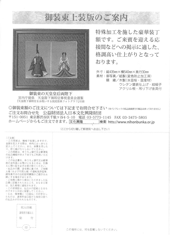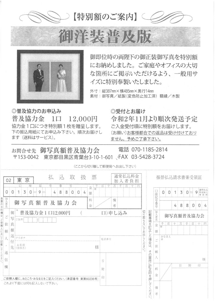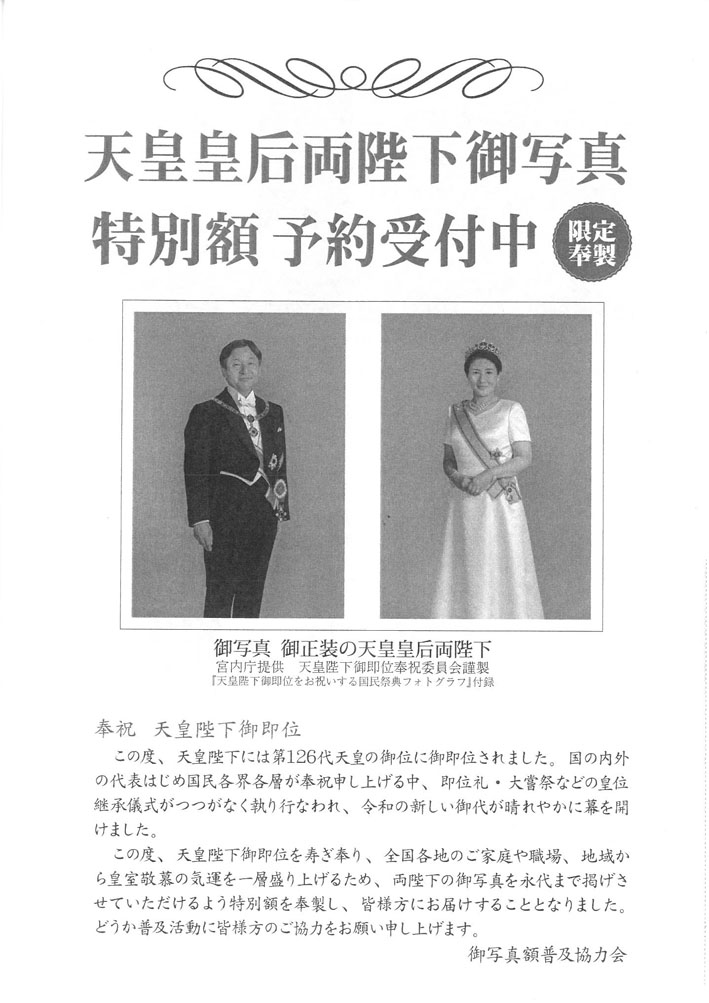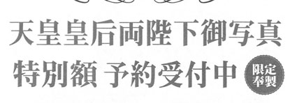 天皇皇后両陛下御写真額をご希望の方は、地区責任者か直接事務所までご連絡ください。 ご注文締め切りは、1月8日(金)までとなっております。お早めにお申し込みください。