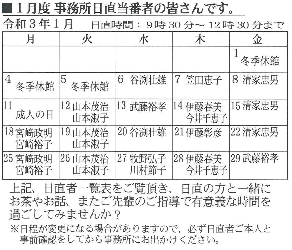 令和3年1月度の事務所日直をお世話頂く、皆さんの一覧表です。是非、ご一緒に茶話会や勉強会、そして情報交換会などで有意義なお時間をお過ごしください。