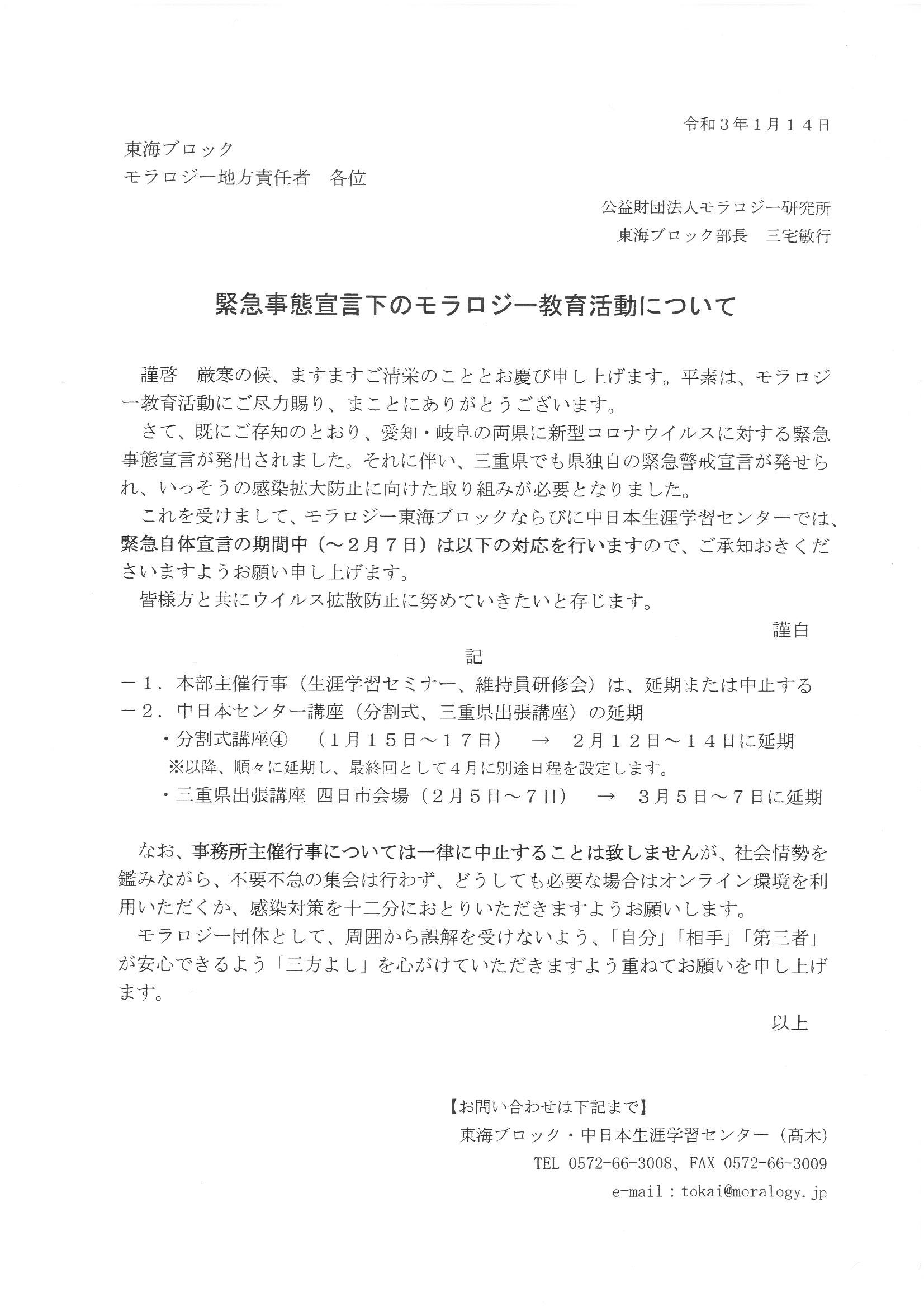 愛知県、岐阜県に緊急事態宣言、三重県には緊急警戒宣言の発出がありました。 このことを受け、東海ブロック三宅敏行部長より以下の連絡がありました。