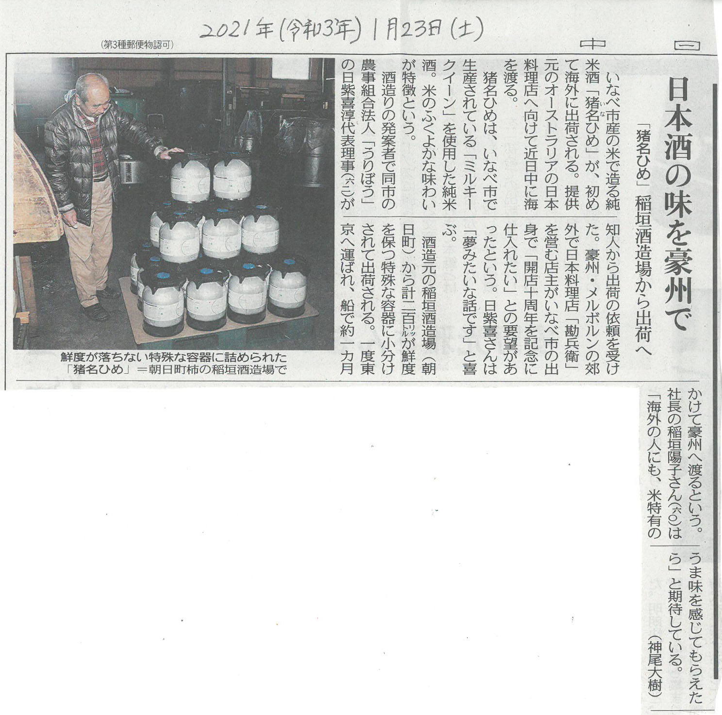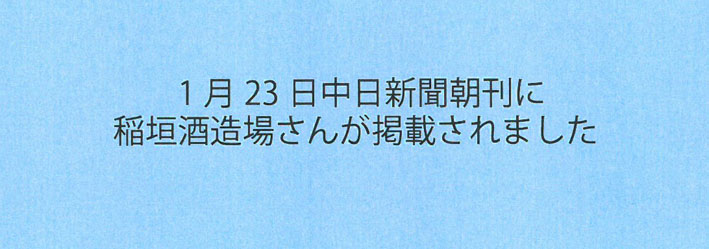 令和3年1月23日の中日新聞朝刊に稲垣酒造場さんの記事が掲載されましたので会員の皆さんに紹介します。
