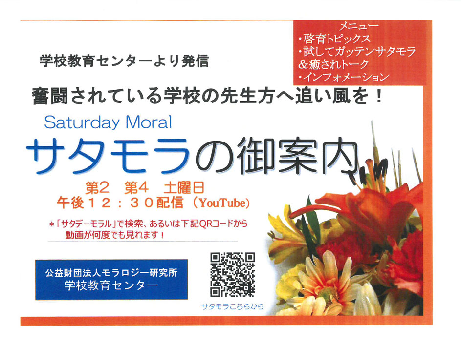 公益財団法人モラロジー道徳教育財団 学校教育センターは、学校の道徳教育現場で奮闘されている先生方をサポートするためにサタディモラル(通称:サタモラ)を配信しています。