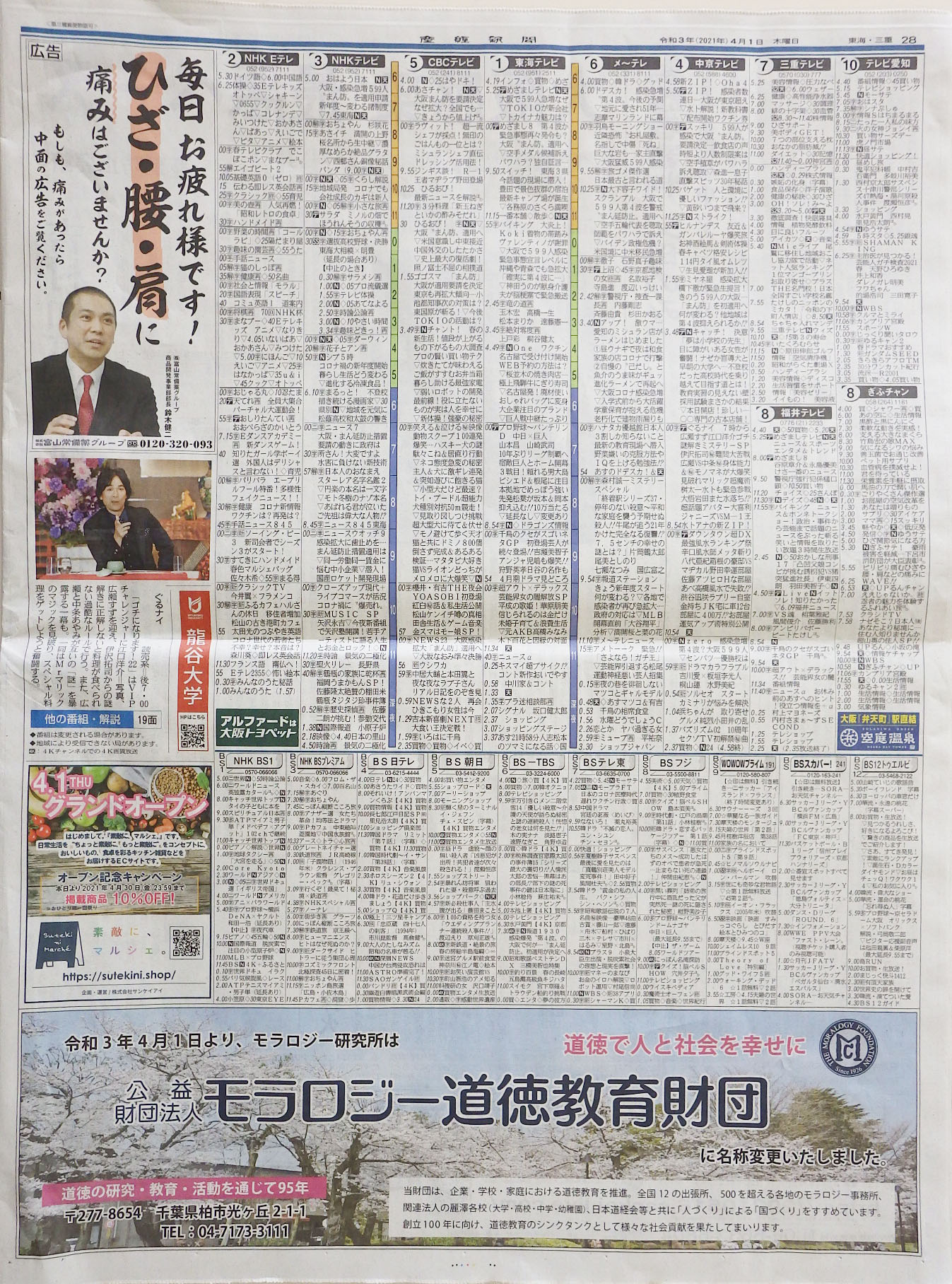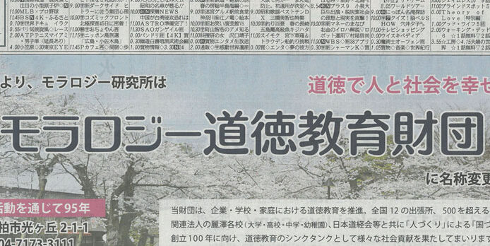 令和3年47月1日、産経新聞朝刊に「モラロジー道徳教育財団」へ名称変更の告知広告の掲載がありました。全国版新聞でテレビ欄の下に掲載されましたので、たくさんの人が見て頂いたことと思います。