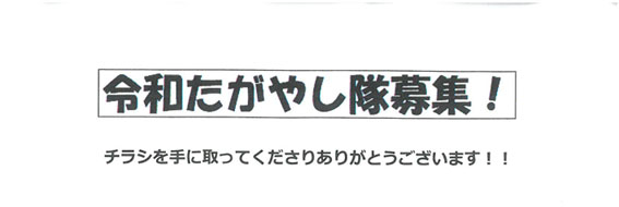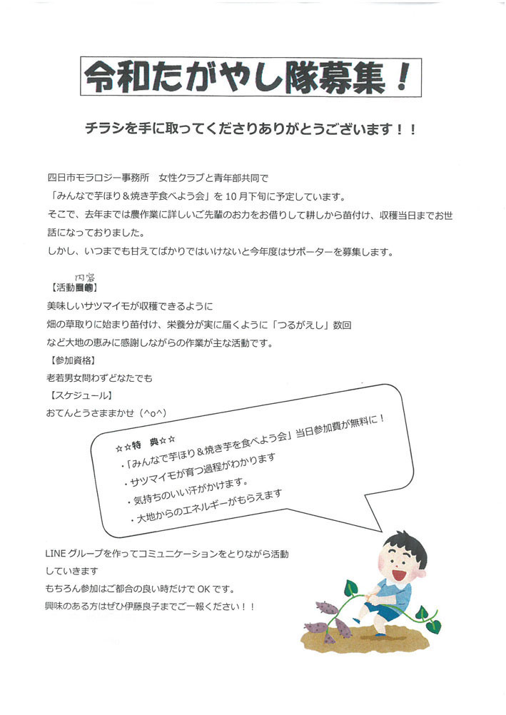 毎年の恒例行事とあんりました「芋ほり大会」ですが、今年からはできるだけたくさんの方で秋の収穫に向けて、準備をしようということで「令和たがやし隊」の隊員を募集します。