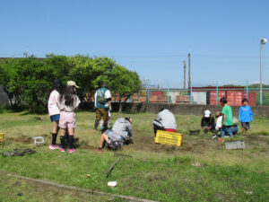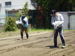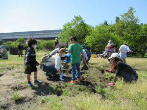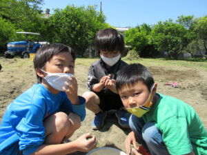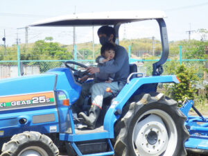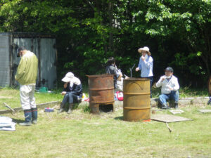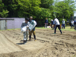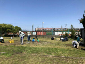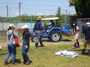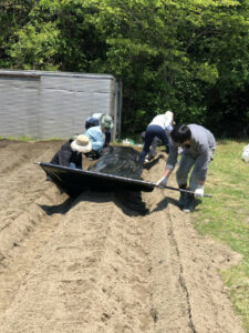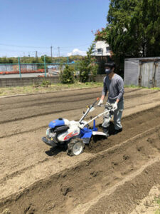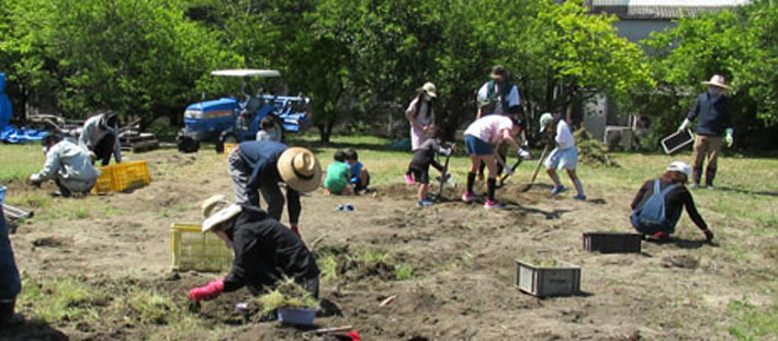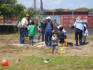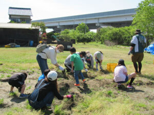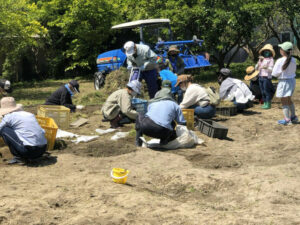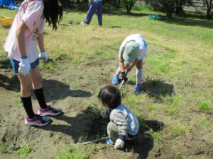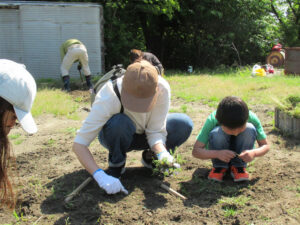 5月3日は、午前と午後の部に分かれて、ご先輩の指導のもと、草取り、畝づくりまでを若いファミリーの皆さんと汗を流しました。