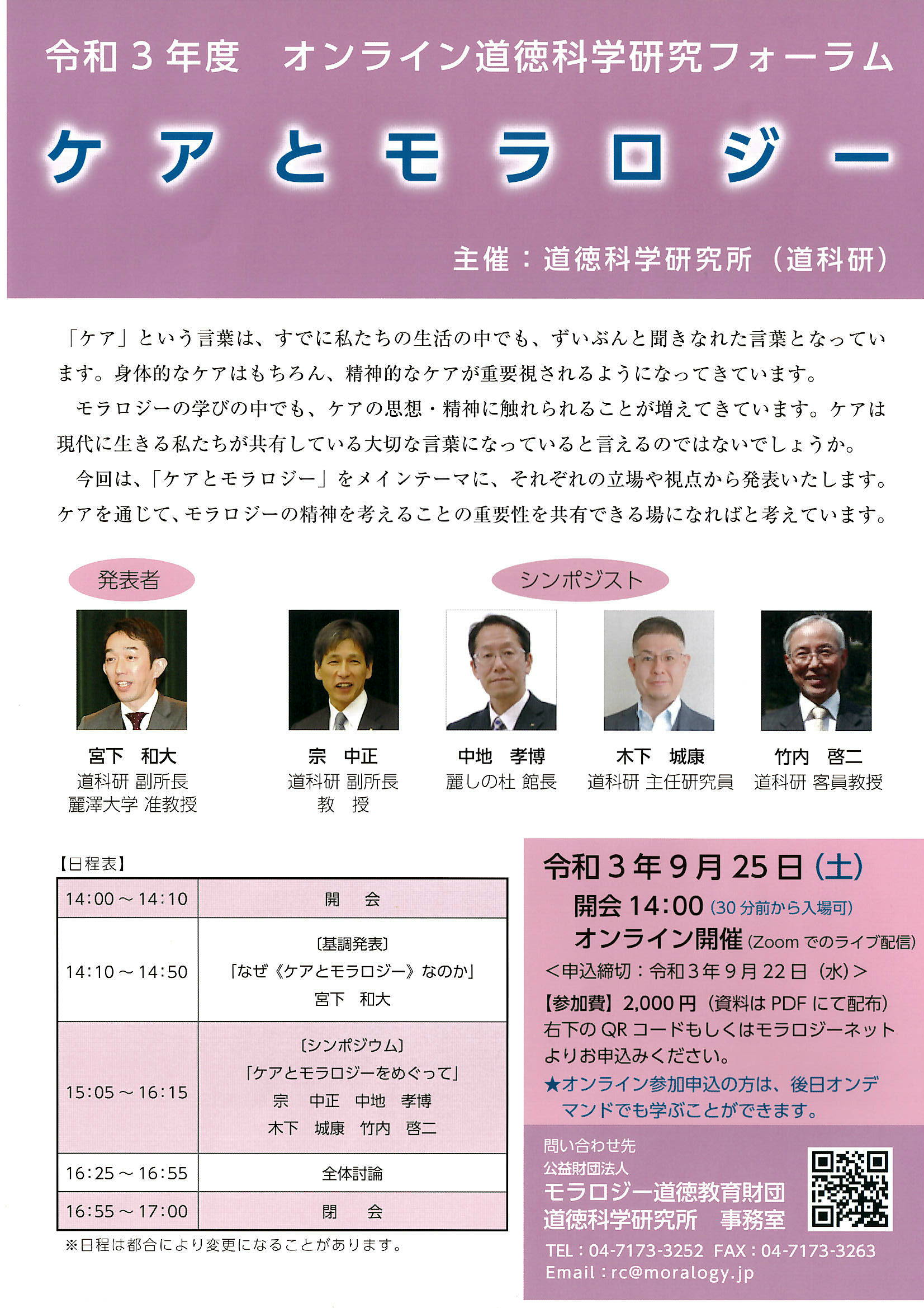 令和3年度 道徳科学研究フォーラムより「ケアとモラロジー」というテーマでの基調発表とシンポジウムがオンライン開催されます。興味のある方は是非アクセスください。