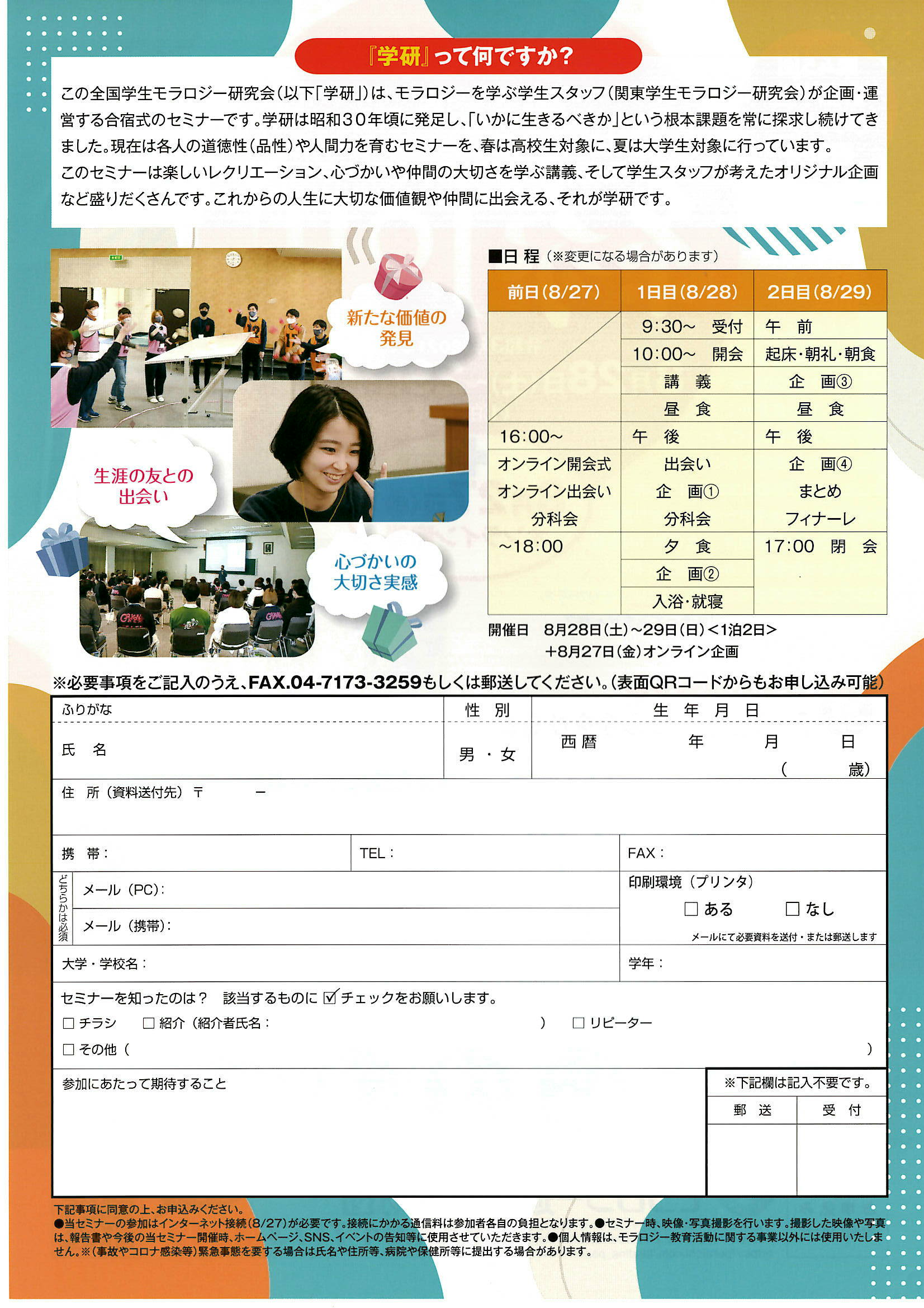 第45回全国学生モラロジー研究会が以下の要領で開催されます。専門学校生、短大生、大学生、大学院生が参加対象です。たくさんの新しい友達ができ、すばらしい仲間と楽しい合宿生活をすることでモラロジーを知る第一歩ともいわれています。一度参加した人は何度も参加につながるほど有意義な学生モラロジー研究会です。是非、子どもさんやお孫さんにおすすめください。