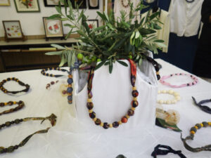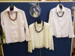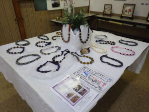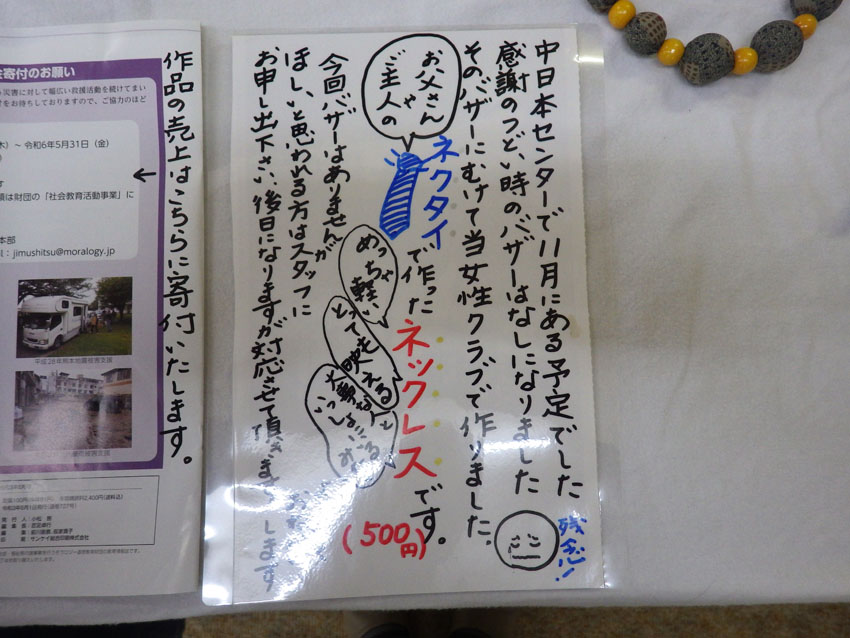 当初は中日本センターでバザーに出店される予定だったそうですが、バザーがなくなり四日市事務所での展示となりました。16日の事務生クラブ一日講演会でもたくさんの皆さんが購入いただいたようです。ネックレスを紹介します。