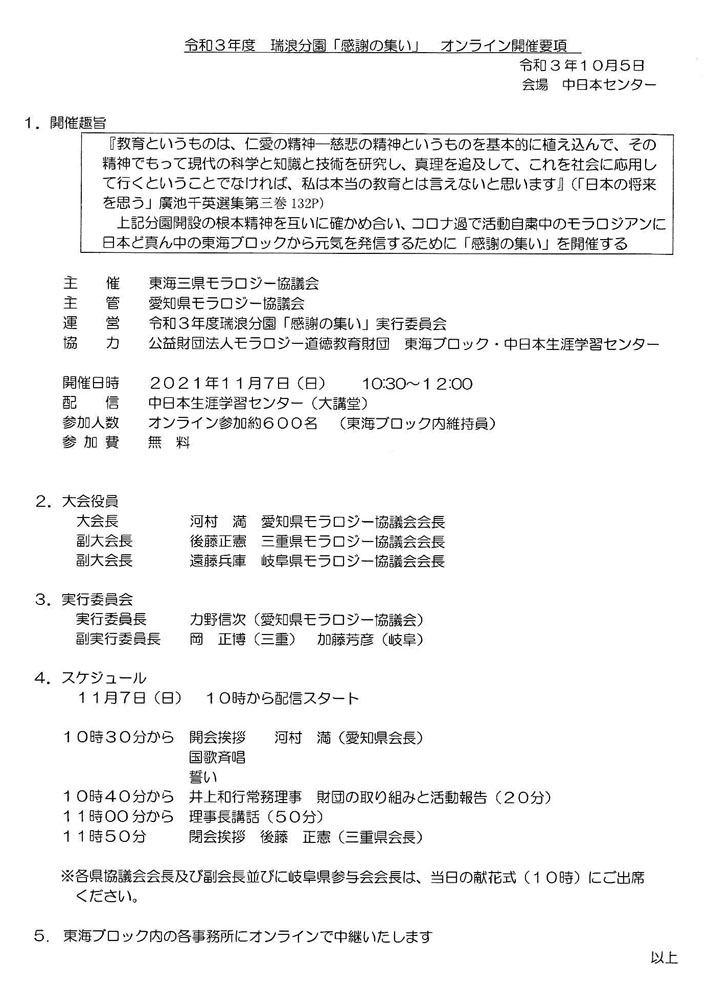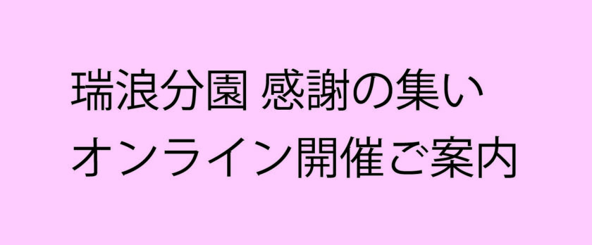 以下に案内の瑞浪分園感謝の集いは、事務所にてオンライン視聴のみとなります。 理事長講話も予定されておりますので、是非とも事務所にてオンラインでの参加をお願いします。