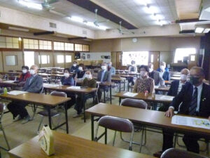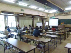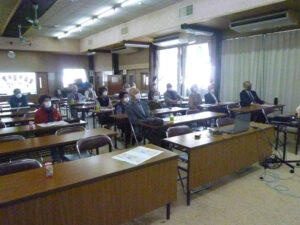 11月07日 瑞浪分園感謝の集いは、新型コロナウイルスへの感染防止のため、一部の方が瑞浪分園に集合され、各地からは各事務所でリモートでの参加となりました。写真は四日市モラロジー事務所講堂で瑞浪分園感謝の集いをリモート参加の皆さんです。