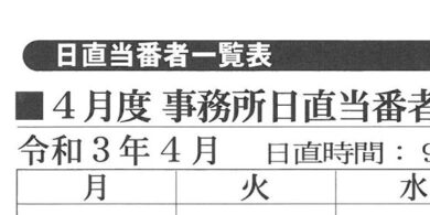 令和3年4月度の事務所日直当番を担当頂く皆さんの一覧表です。都合により変更になる場合もありますのでご了承ください。…
