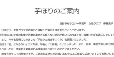 女性クラブの皆さんで企画、計画、準備をして頂いております「秋の芋ほり大会」の案内チラシを掲載します。今年はコロナの影響も…